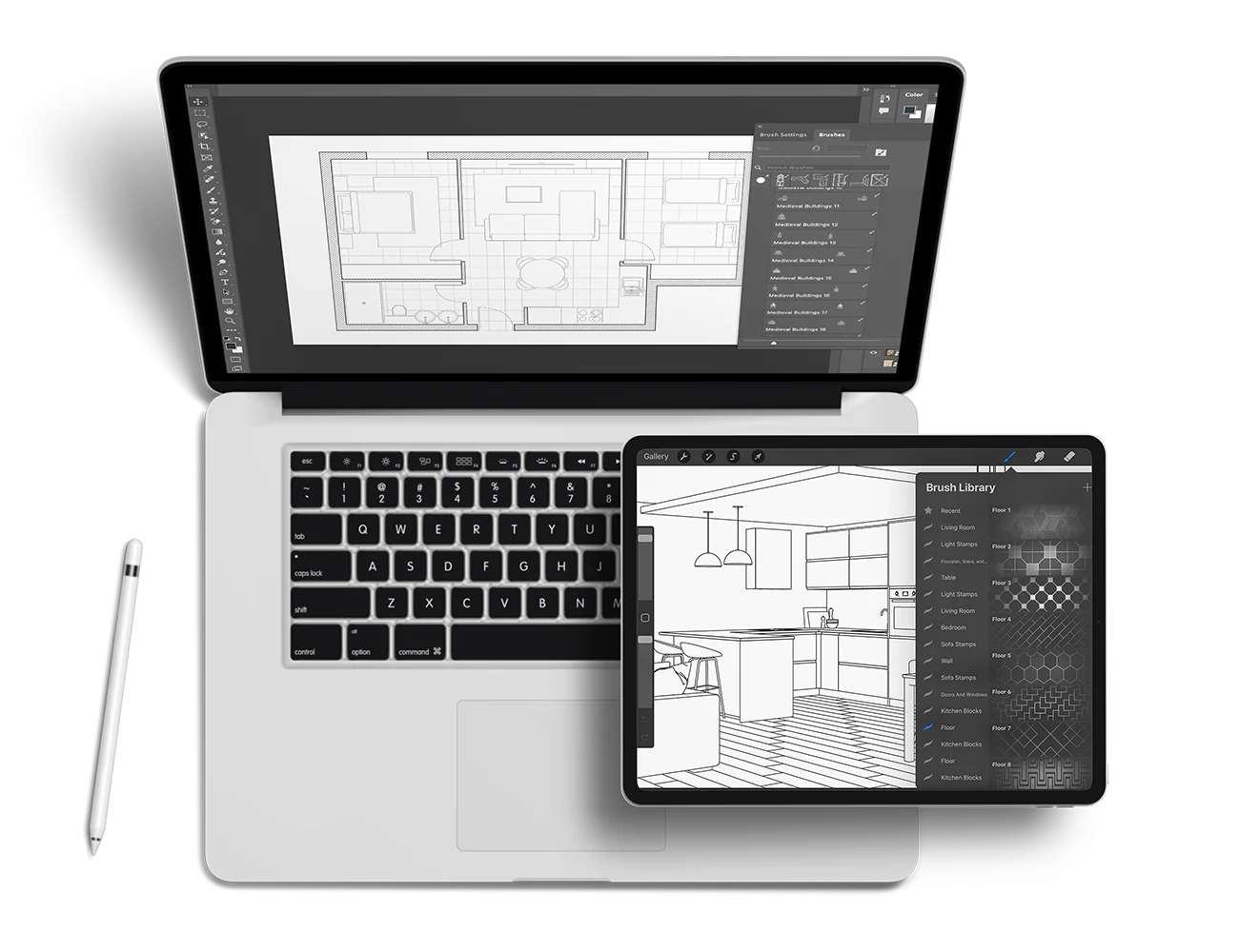 Hand-rendered brushes and stamps speed up ideation and communication. Focus on your creativity, not repetitive details.