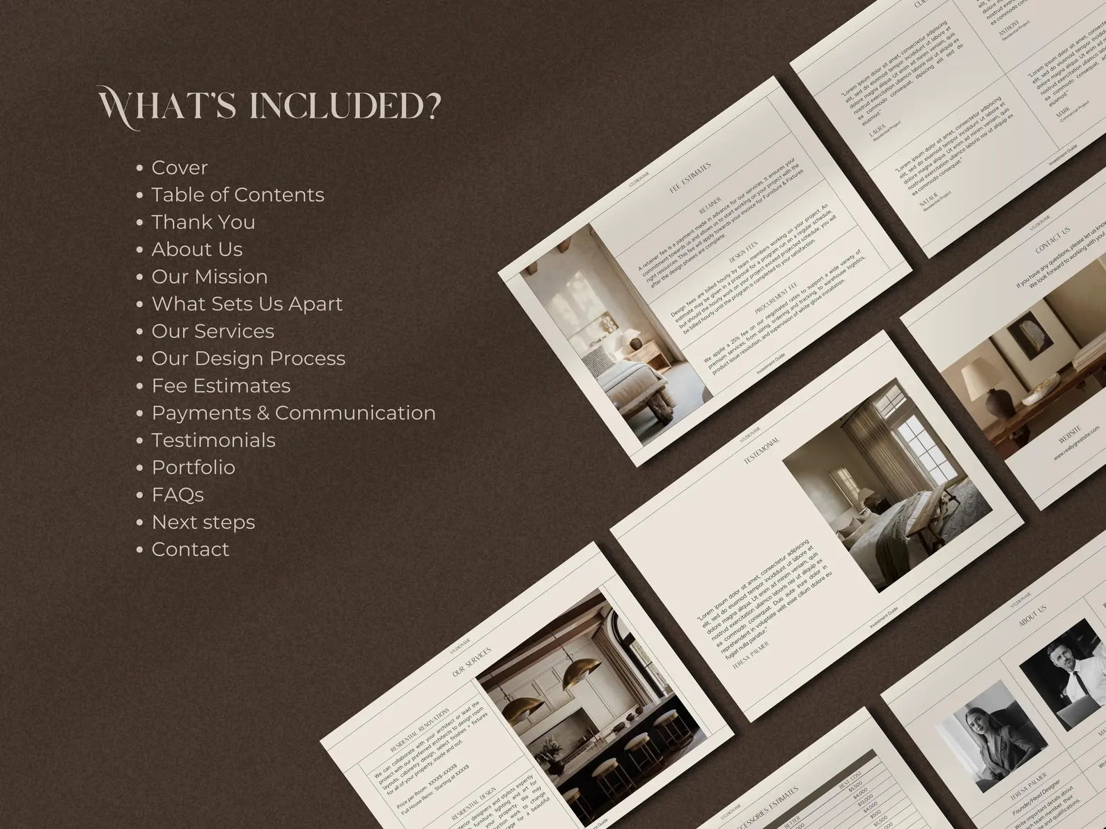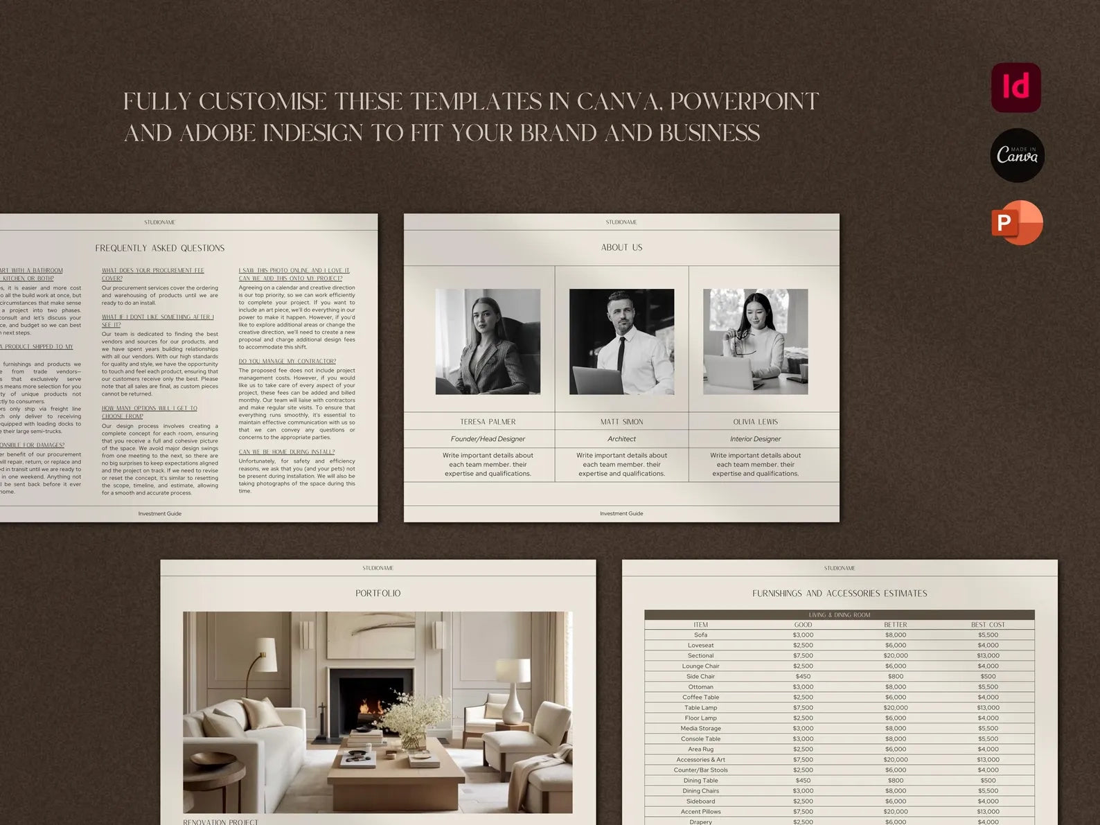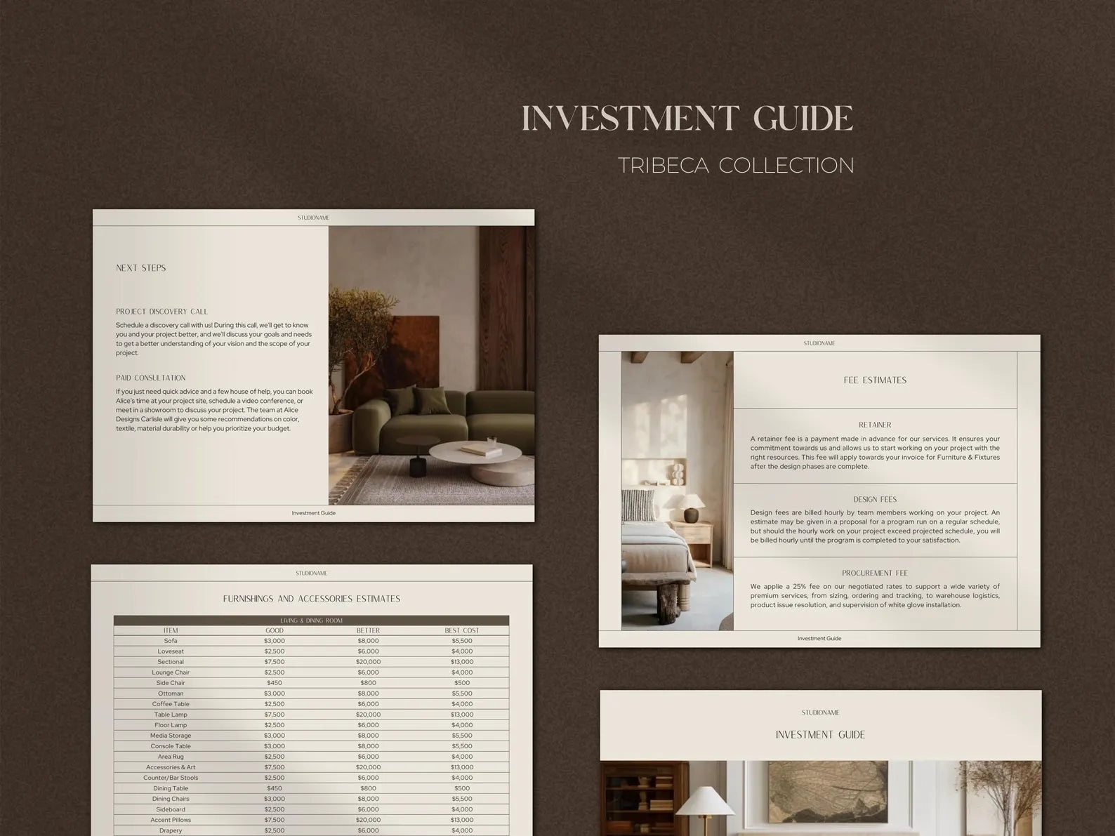 Proposals that win projects. Presentations that guide clients through your thinking. Onboarding guides that set boundaries. FF&E schedules that track procurement. Goodbye packets that close projects cleanly.